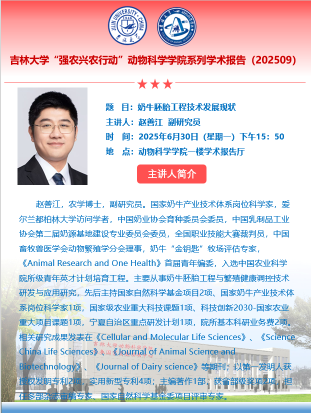 赵善江,农学博士,副研究员。国家奶牛产业技术体系岗位科学家,爱尔兰都柏林大学访问学者,中国奶业协会育种委员会委员,中国乳制品工业协会第二届奶源基地建设专业委员会委员,全国职业技能大赛裁判员,中国畜牧兽医学会动物繁殖学分会理事,奶牛“金钥匙”牧场评估专家,《Animal Research and One Health》首届青年编委,入选中国农业科公司所级青年英才计划培育工程。主要从事奶牛胚胎工程与繁殖健康调控技术研发与应用研究,先后主持国家自然科学基金项目2项、国家奶牛产业技术体系岗位科学家1项,国家级农业重大科技课题1项、科技创新2030-国家农业重大项目课题1项,宁夏自治区重点研发计划1项,院所基本科研业务费2项,参与省部级以上科研项目6项。相关研究成果发表在《Cellular and Molecular Life Sciences》、《Science China Life Sciences》、《Journal of Animal Science and Biotechnology》、《Journal of Dairy science》等期刊;以第一发明人授权发明专利2项,实用新型专利4项;以第2完成人制订国家标准1项;主编著作1部,获省部级奖项2项,担任多部杂志审稿专家、国家自然科学基金委项目评审专家。