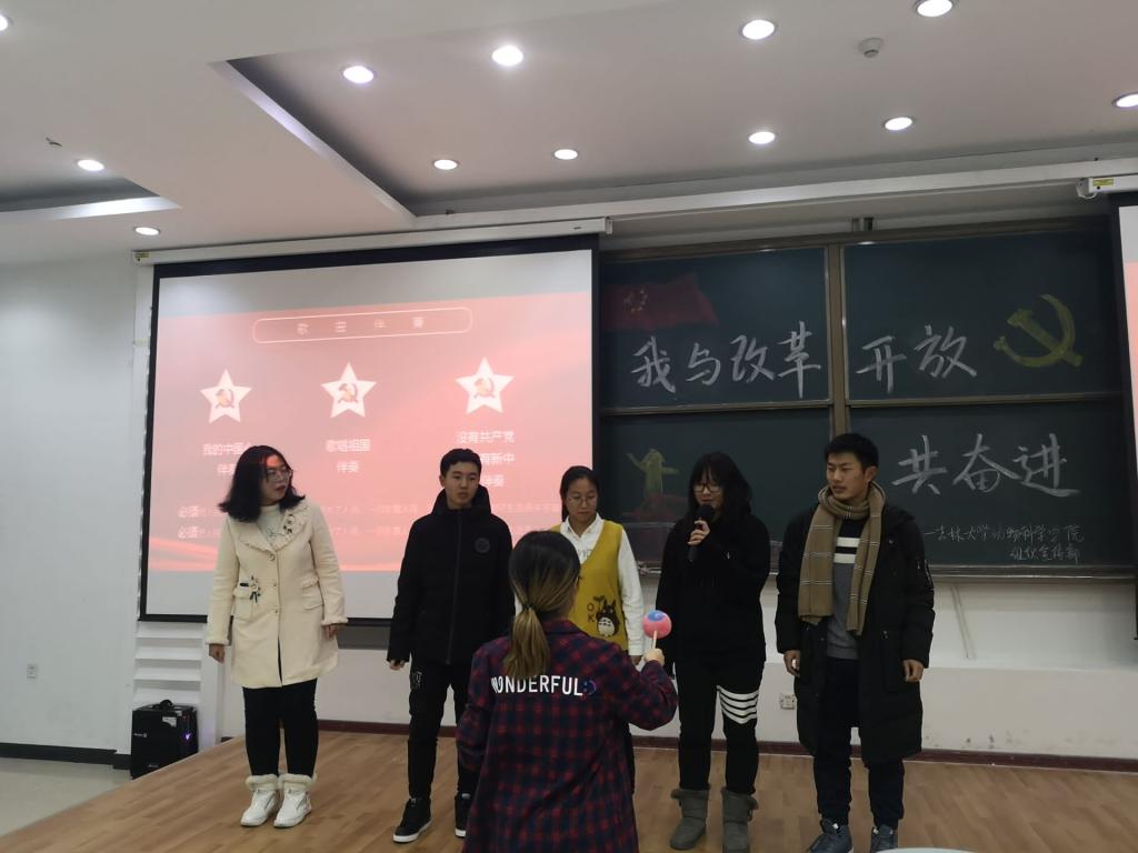 活动伊始,主持人吕焱、赵天玥致开幕词,向同学们介绍到场嘉宾。随后同学们观看了改革开放四十周年相关视频——《变与不变》。通过精彩的视频同学们更加了解改革开放四十周年以来中国发生的翻天覆地的巨大变化,提高的是人民的生活水平,不变的是人们心中对幸福的渴望和追求。为活跃现场气氛,由2018级同学为大家带来了十分精彩的小节目:运用多国语言完美呈现的歌曲《告白气球》演绎了新一代年轻人的青春活力;而《牵手理想》则以支教员工的独特视角展现了当代老员工的社会时代使命和责任担当;一曲《北京东路的日子》又将同学带回了青涩的中学时代。