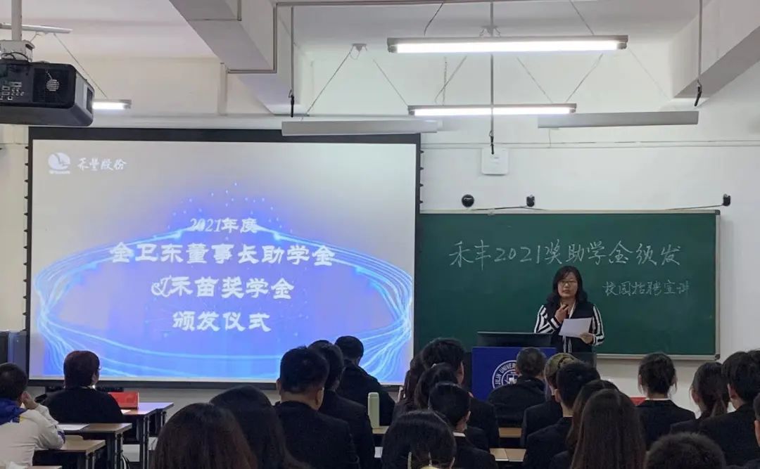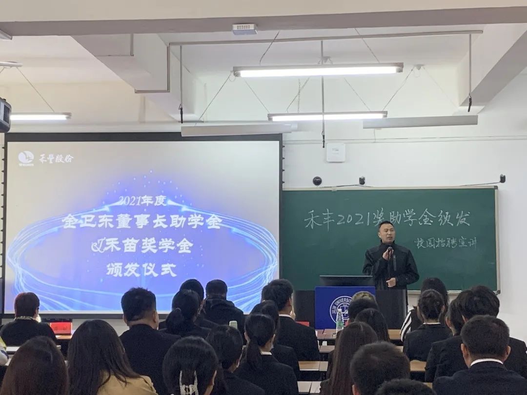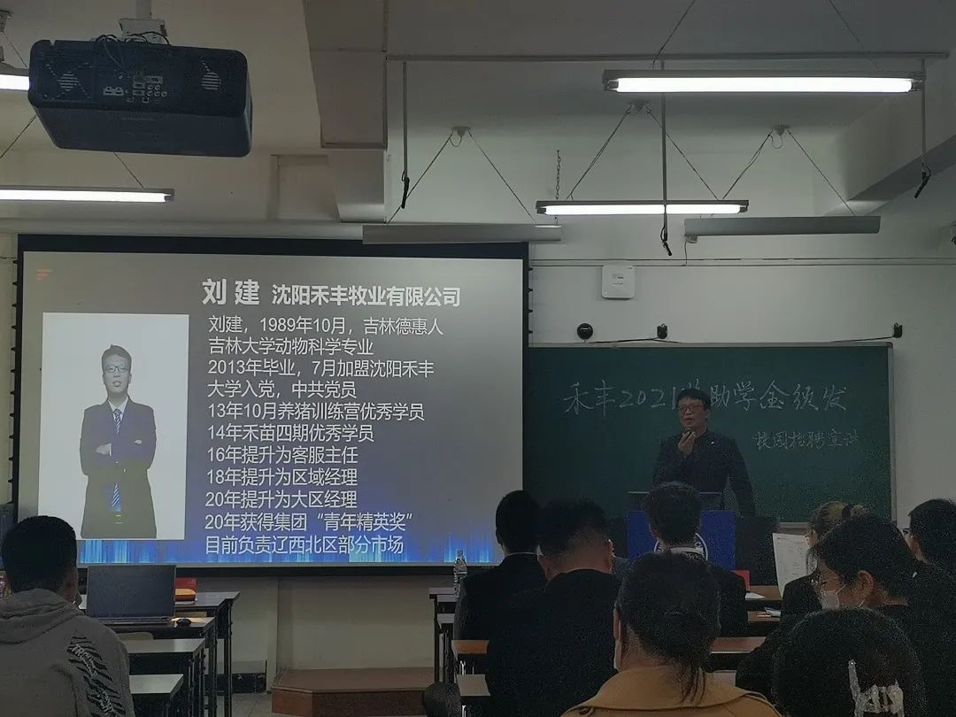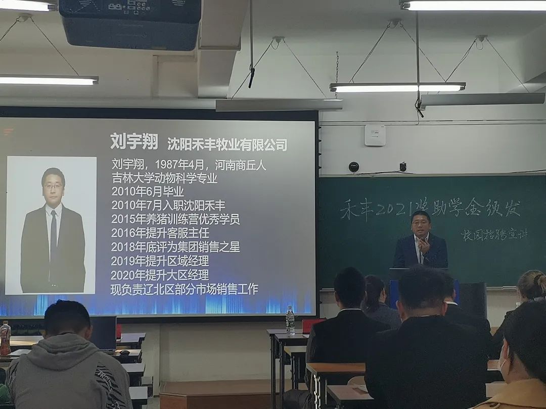 情系高校学子,聚焦农科人才,成就青年梦想。10月29日下午13:00,禾丰董事长助学金、禾苗奖学金颁发仪式暨禾丰牧业校园招聘会在意昂体育和平校区科学讲堂301教室顺利举办。出席本次活动的有禾丰股份辽宁区人力资源总监付明、辽宁区招聘COE杜娟,沈阳禾丰牧业有限公司销售总经理吴东波,大区经理刘建、刘宇翔,人力资源经理王雪,动物医学公司党委书记饶家辉、党委副书记秦明、学办主任谭瑶,公司党委副书记肖建荣。